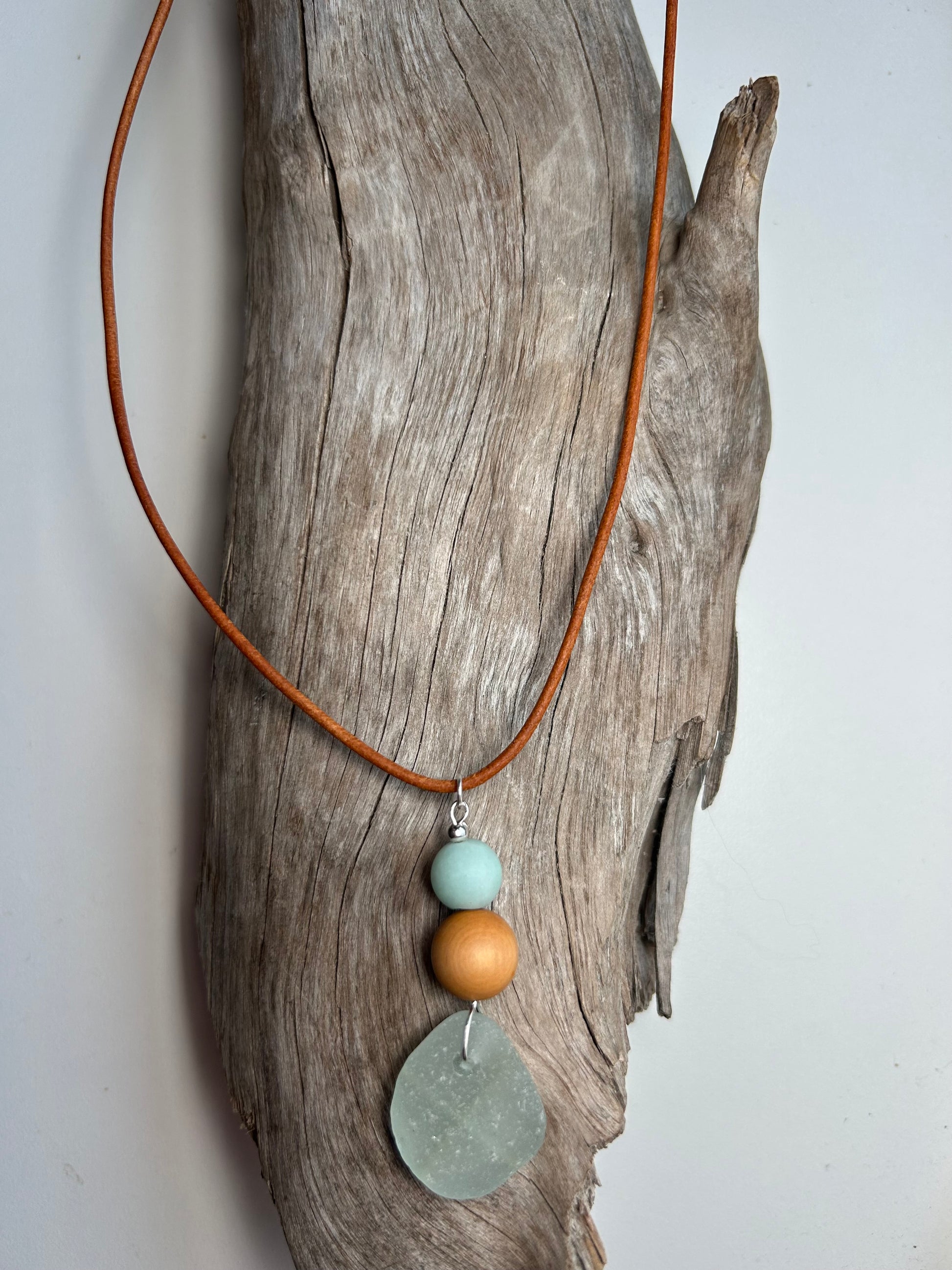 Genuine sea glass pendant attached with hypoallergenic 925 sterling silver measuring 2" long, made with Amazonite and a wooden bead