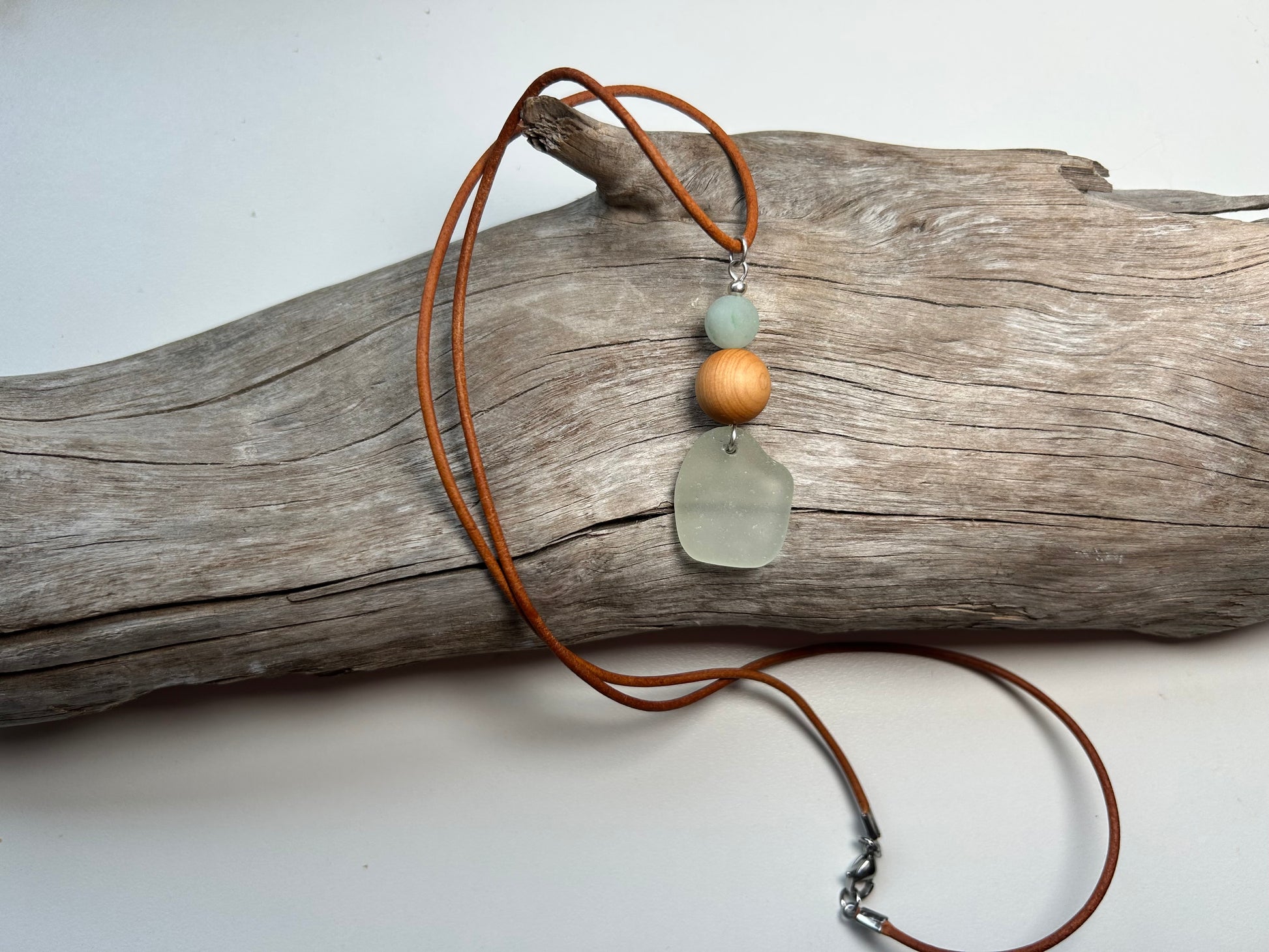Genuine Sea Glass Lake Superior 24” Amazonite Pendant Genuine Leather Boho Zen Necklace